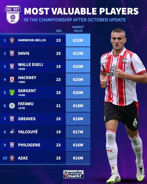 英冠身价前十名最新榜单:贝利斯和戴维斯以2200万欧元排名第一,伊镇有四名球员上榜_英超直播免费