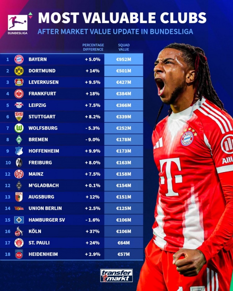 近期,德转对德甲各队的身价进行了更新,呈现出一幅丰富多彩的足球市场图景,力图体现球队实力的波动和未来潜力的展望。我们来一起看看这些动人的数字背后,蕴含着怎样的故事。